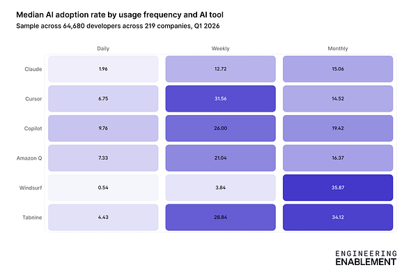 AI tooling benchmarks: PR throughput and usage by tool (Q1 2026)