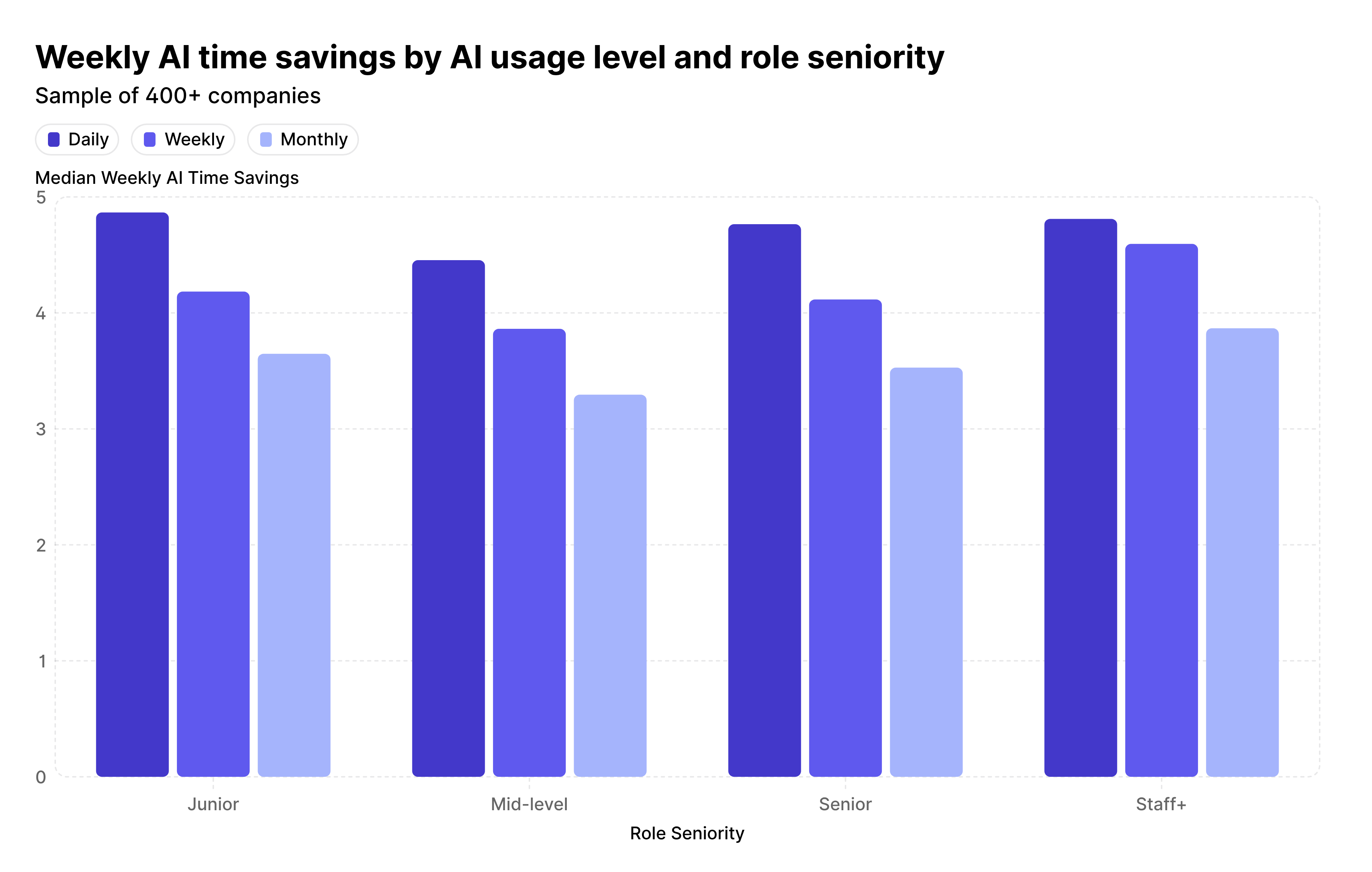 Junior engineers who use AI daily are now saving 4.9 hours per week, edging out daily Staff+ users who are saving 4.8 hours.