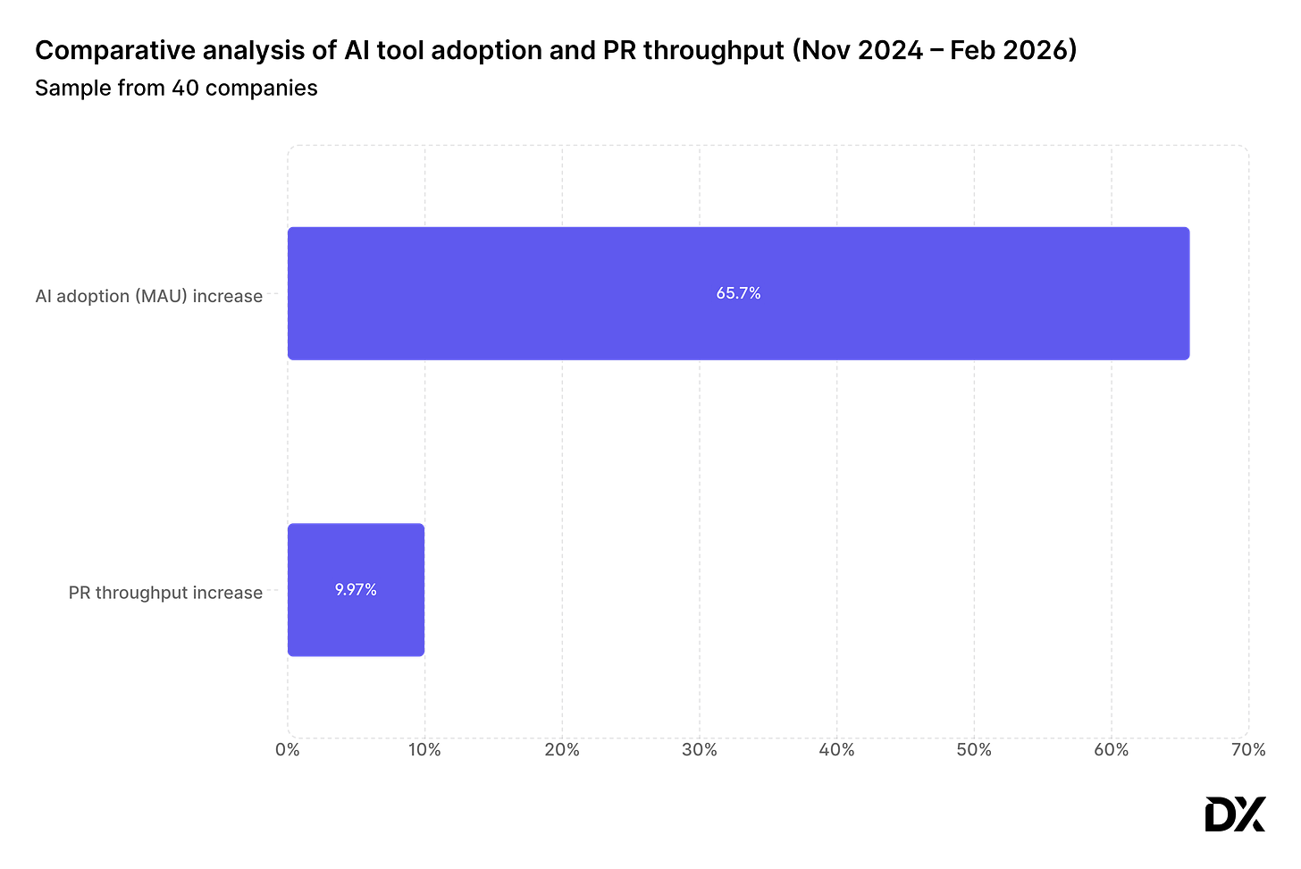At DX, we’re currently conducting a longitudinal study to measure the long-term impact of AI adoption on key engineering productivity metrics. As part of this study, we analyzed data from 40 companies between November 2024 through February 2026 to track whether teams are shipping more pull requests as AI adoption increases.