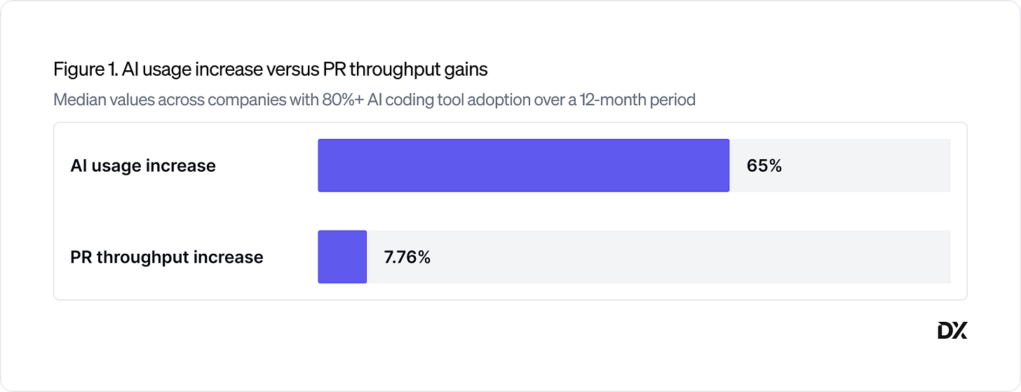 Over the past 16 months, DX has been running a longitudinal study on AI’s impact on engineering velocity across a sample of more than 400 engineering organizations. We found that as AI tool usage increased by an average of 65%, median PR throughput increased by just under 8%. Most organizations are landing in the 5–15% range—a meaningful gain, but far below the 3x or 10x expectations many leaders are being held to.
