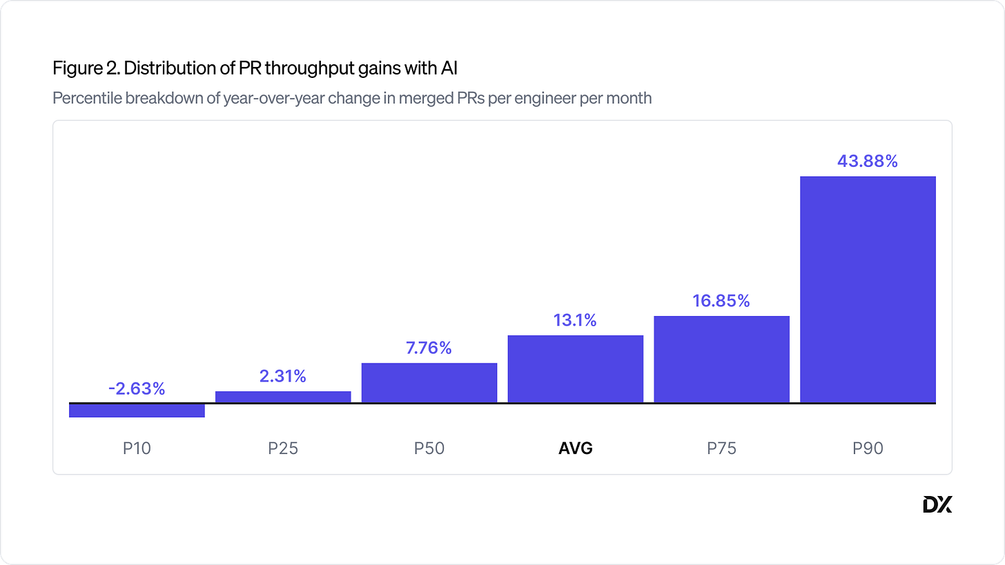 What we ultimately found is that most organizations fall in the 10-15% range in terms of PR throughput increase. The actual median was around 8%, the mean was around 11%. So a real gain, but well below what most leaders expect.