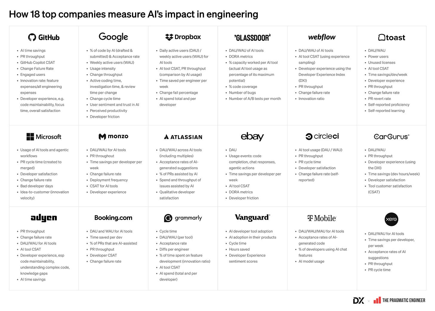 A quick note to share that I wrote a guest post for The Pragmatic Engineer. I interviewed leaders at 18 companies to learn which metrics they use to measure AI’s impact on software engineering.