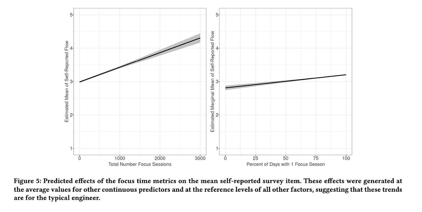 Researchers performed a second validation analysis using data from a quarterly survey. Developers were asked to reflect on the previous three months and respond to the question, “How often are you able to reach a high level of focus or achieve flow during development tasks?” (on a 5-point scale). Three quarters of survey results were used, and the surveys used sampling methods, representing a full census of Google’s developer population. Researchers found that the total number of focus sessions an individual had in a quarter was a positive predictor of self-reported flow.