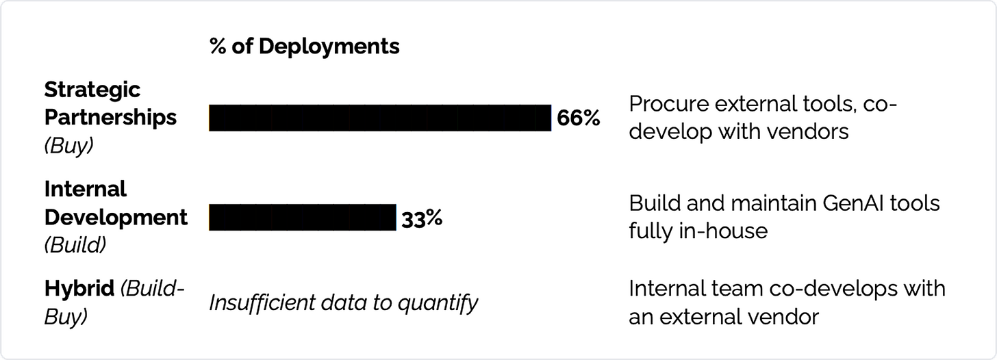 Organizations that crossed the AI Divide approached implementation differently. Rather than building AI systems entirely in-house, they were far more likely to partner with external vendors. Externally sourced tools reached deployment at roughly twice the rate of internal builds, which frequently failed due to brittleness and poor workflow fit.