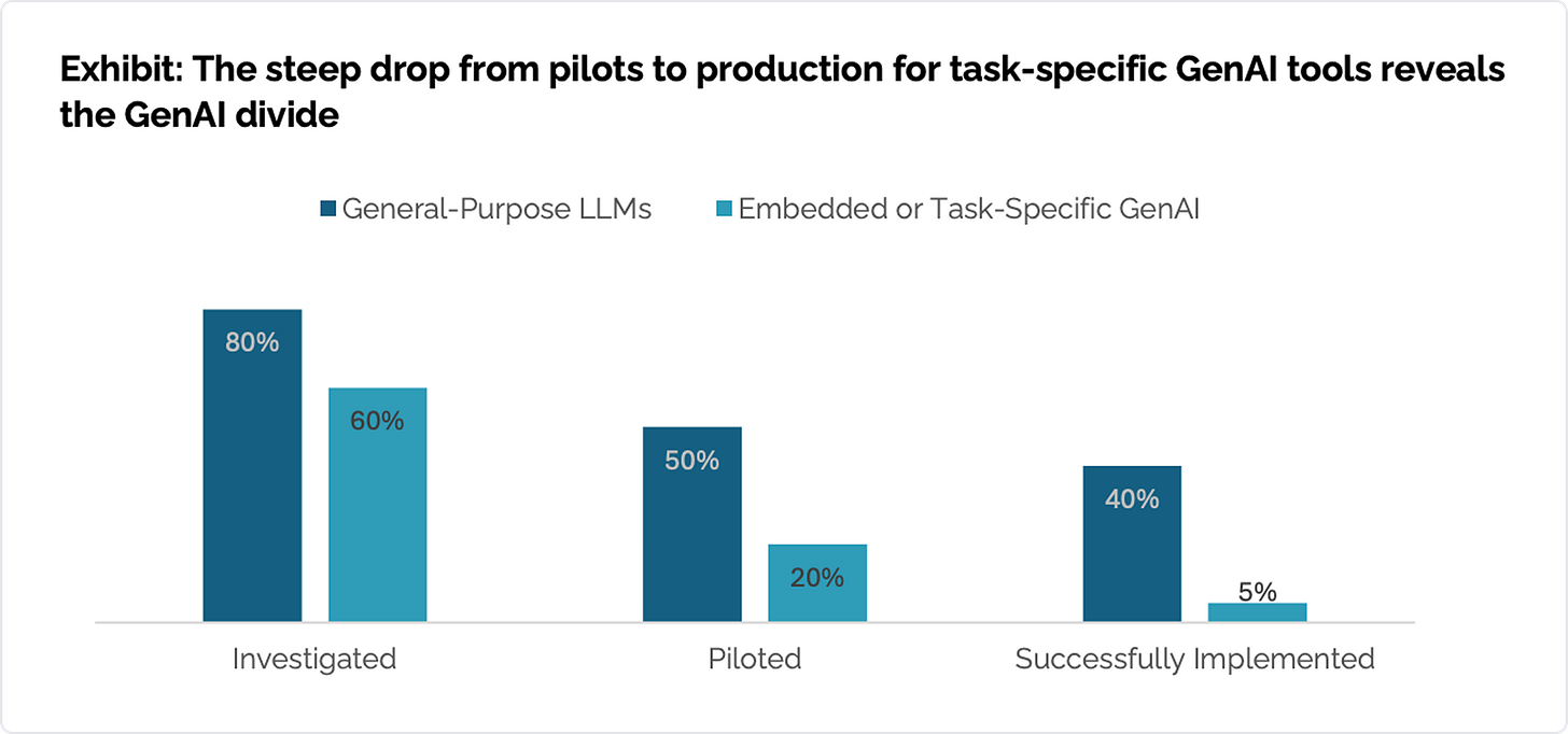 The most visible expression of the AI Divide is the steep drop-off from experimentation to real deployment. While many organizations evaluate AI tools, very few succeed in moving them into production. Roughly 60% evaluated task-specific or enterprise AI systems, about 20% reached pilot stage, and just 5% deployed systems that delivered sustained productivity or P&L impact.